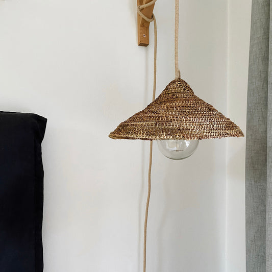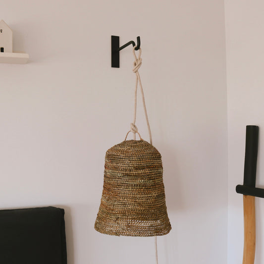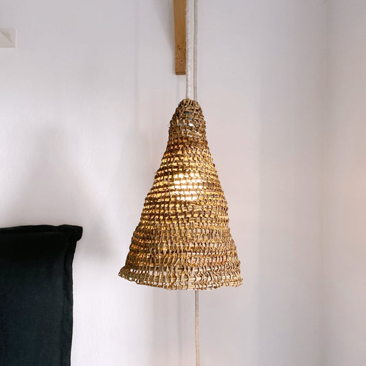 Una serie de lámparas únicas, tejidas a mano con una trama llena de detalles, sin una forma perfectamente definida y con colores propios de la fibra de manila que van desde el verde al café.